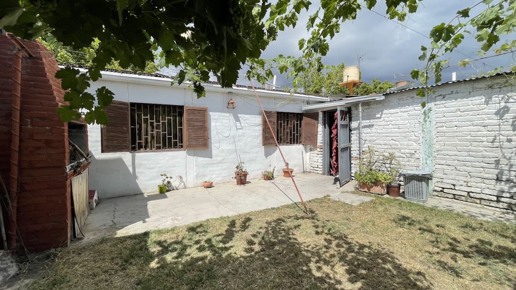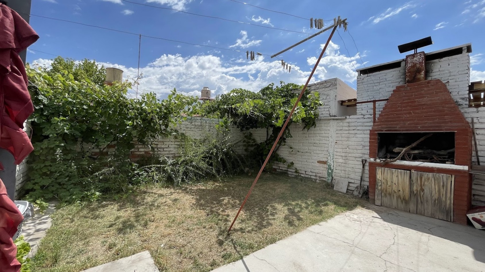 Patio con churrasquera y varias plantas ornamentales y vides.