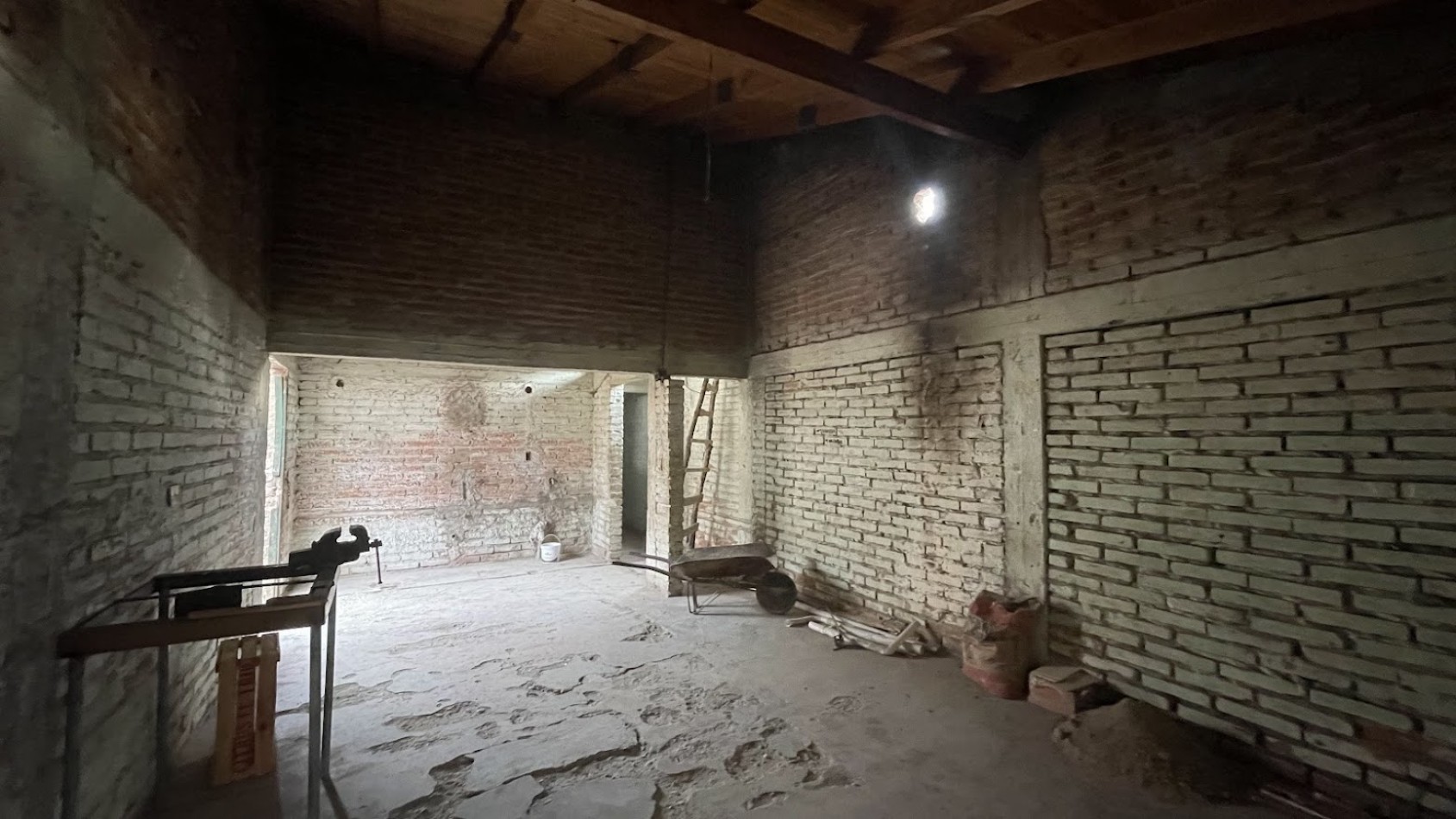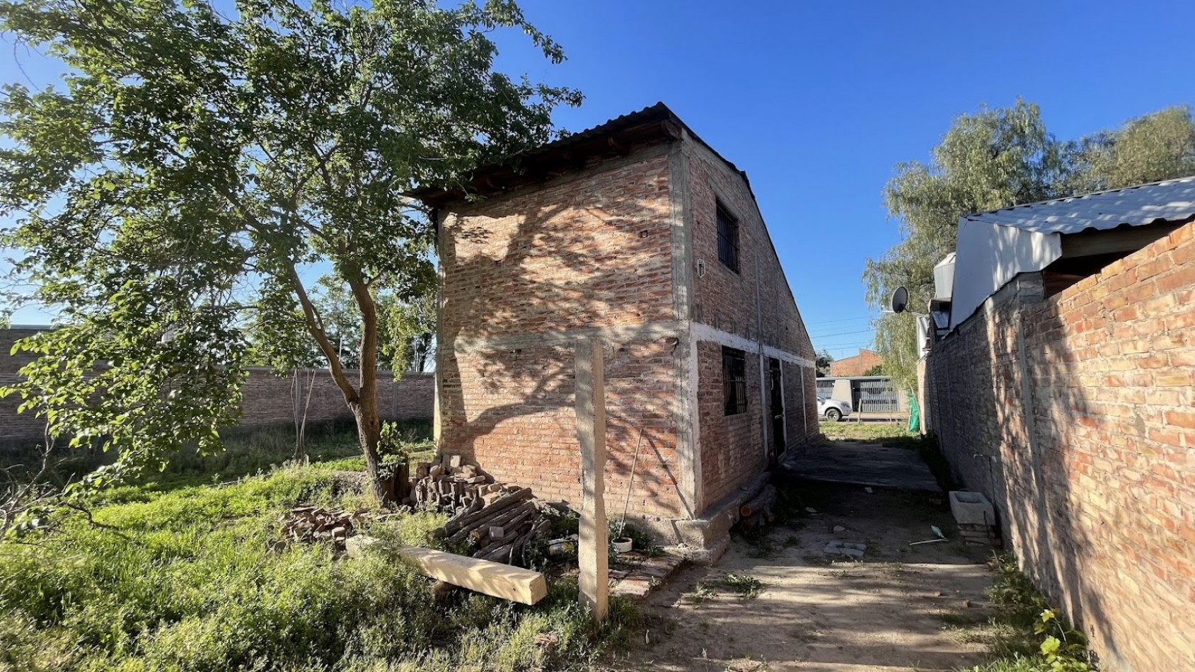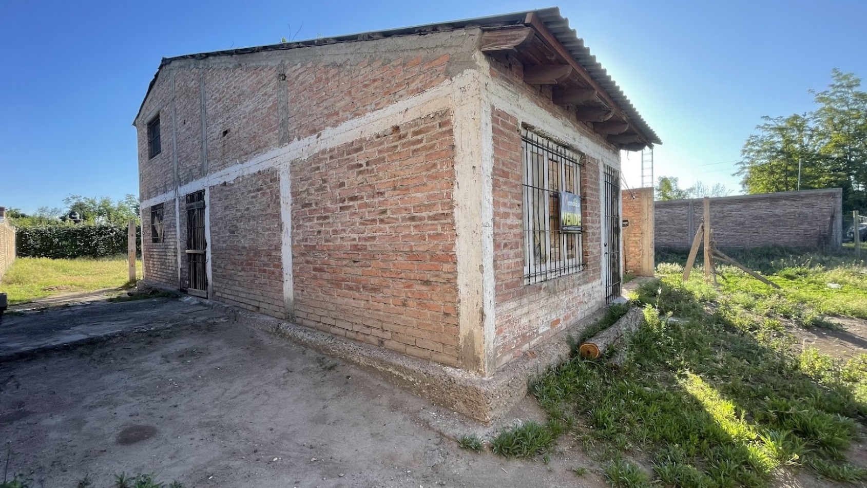 La casa construida en ladrillos cocidos y normas antisísmicas posee un avance de obra gruesa de aproximadamente un 60%. El techo es de chapas de zinc.