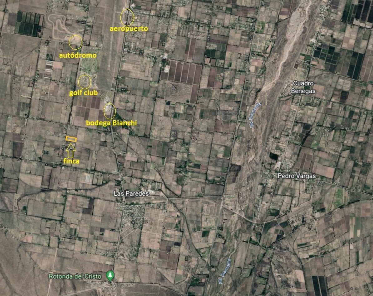 Mendoza Bienes Raíces vende finca de 2 hectáreas (81,5m. de frente x 245m. largo) ubicada sobre calle Las Virgenes casi llegando a calle Iaccarini y su camino turístico del Vino. Ubicación estratégica para emprendimiento turístico ya que se encuentra a solo 2 kilómetros del aeropuerto y solo 4 km del centro de la ciudad de San Rafael Mendoza.