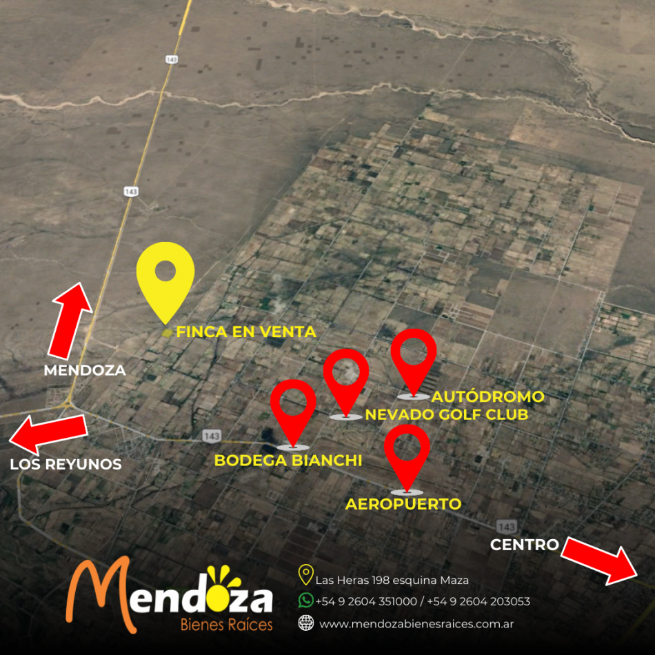 La finca se encuentra a solo 6,8 km de la bodega Bianchi, 8km del Aeropuerto y solo 10 kilómetros centro de la ciudad de San Rafael Mendoza. Varios complejos de cabañas y posadas turísticas se encuentran a inmediación de la propiedad.