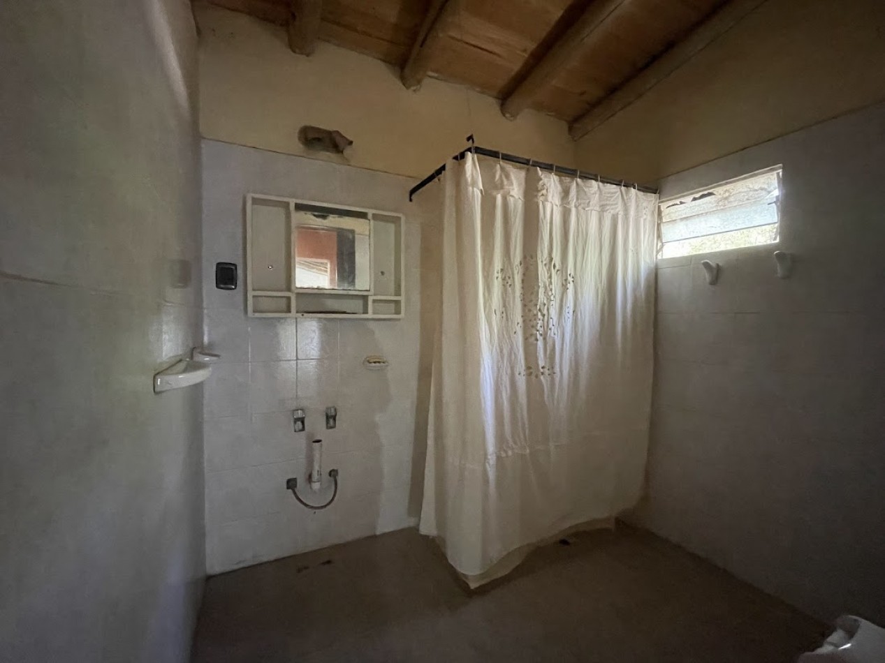 - B: Casa (72m² - a restaurar) compuesta de 2 habitaciones, living comedor cocina con estufa a leña, baño con ducha.